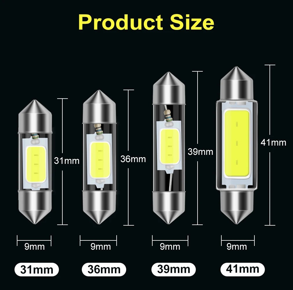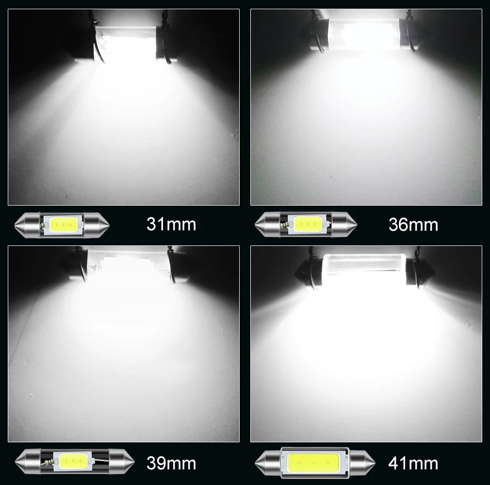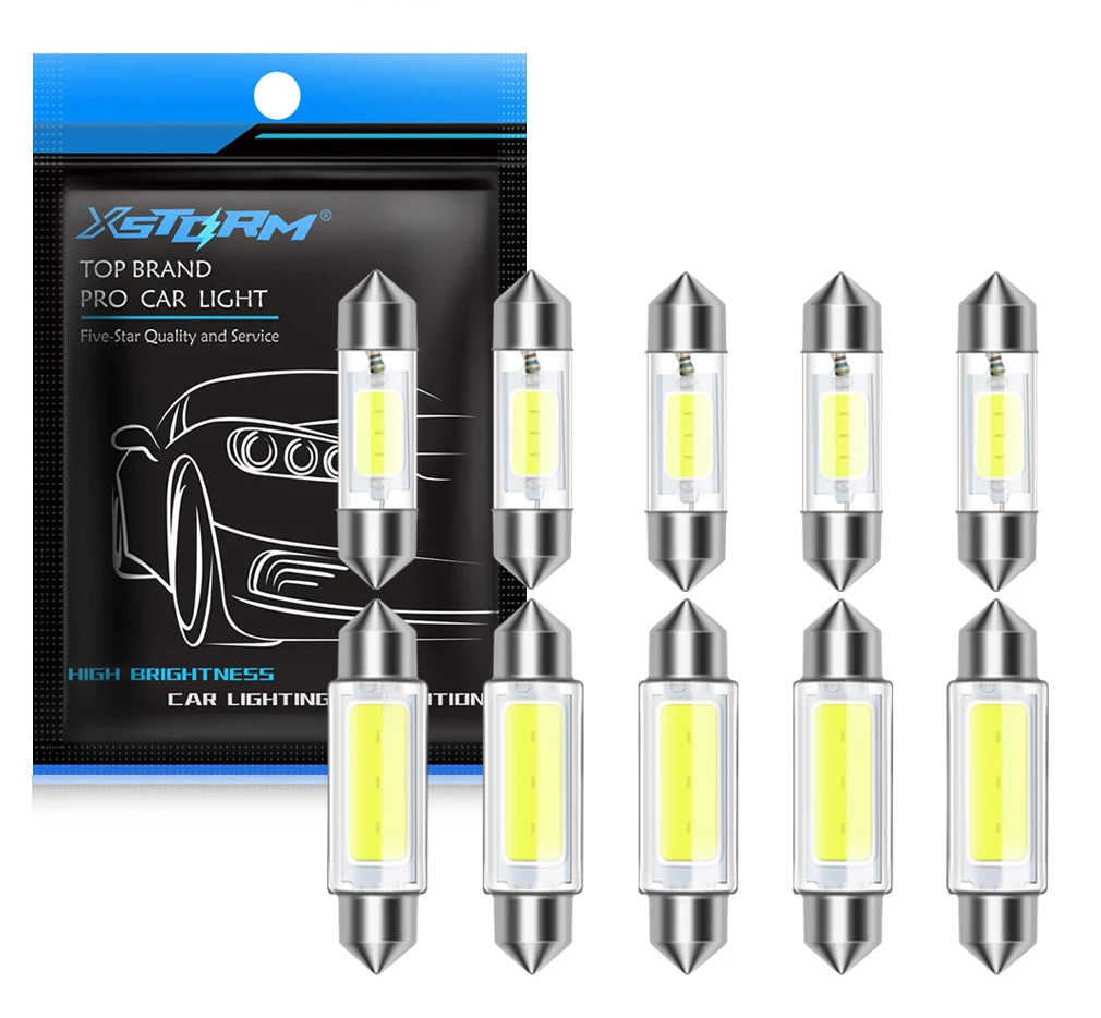 - 10-delt LED-sæt: Inkluderer C5W- og C10W-pærer i størrelserne 31 mm, 36 mm, 39 mm og 41 mm.