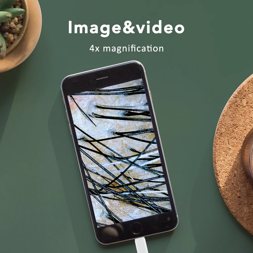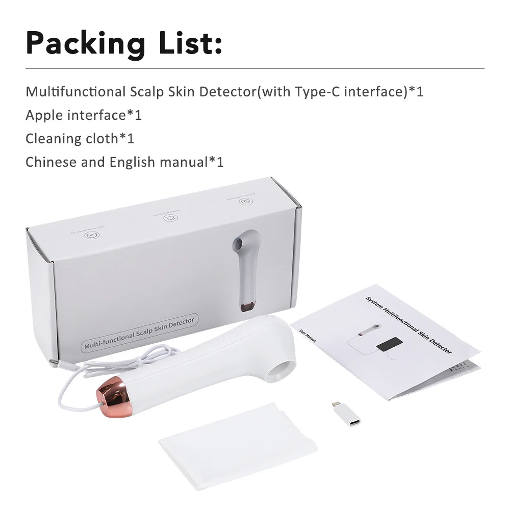 - Omfattende analyseværktøj: Tjek hovedbundens sundhed, hårsækkene og hudens generelle tilstand hurtigt og nemt.