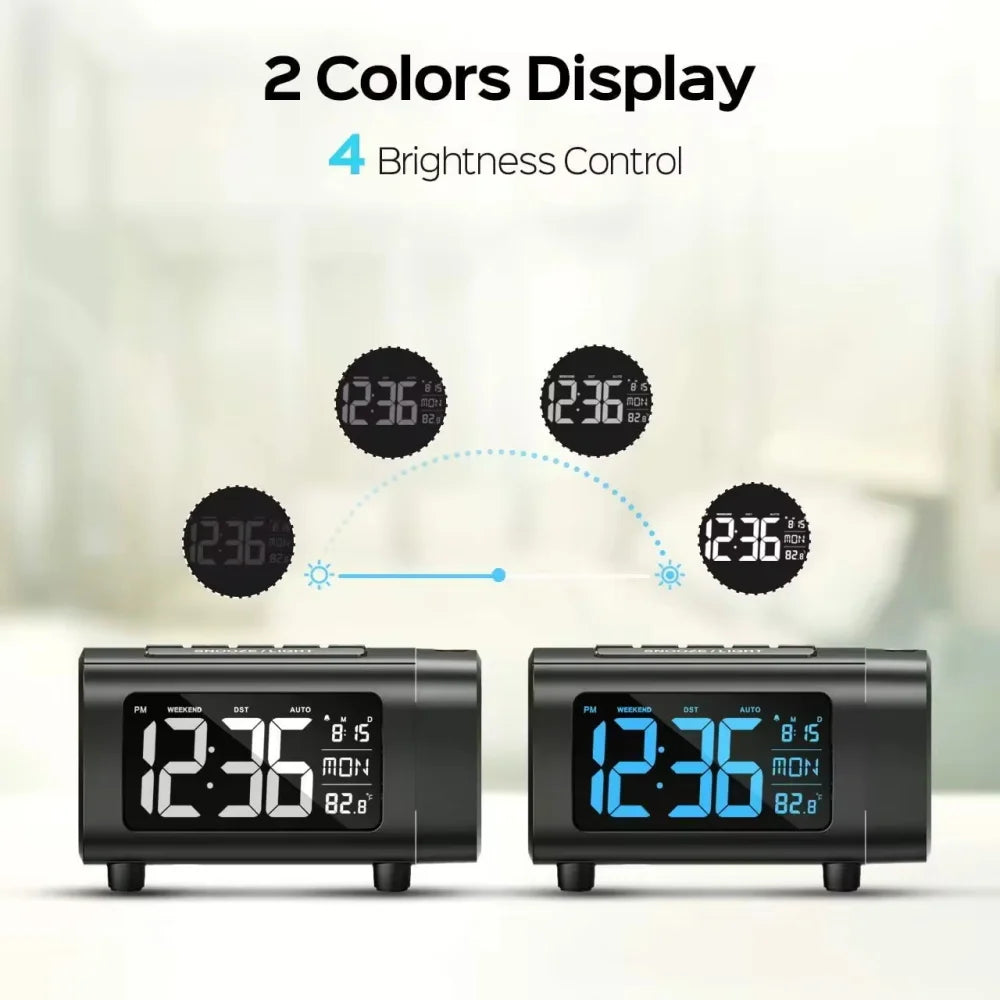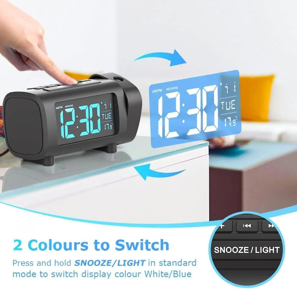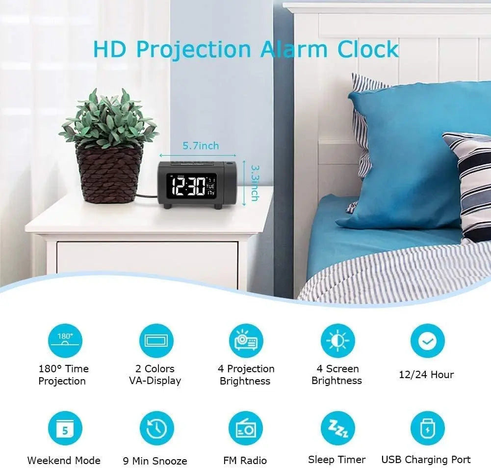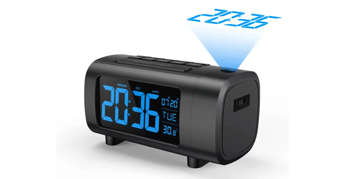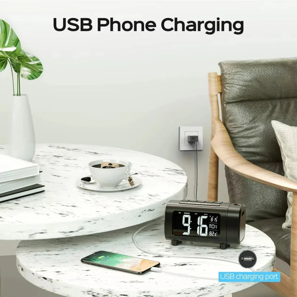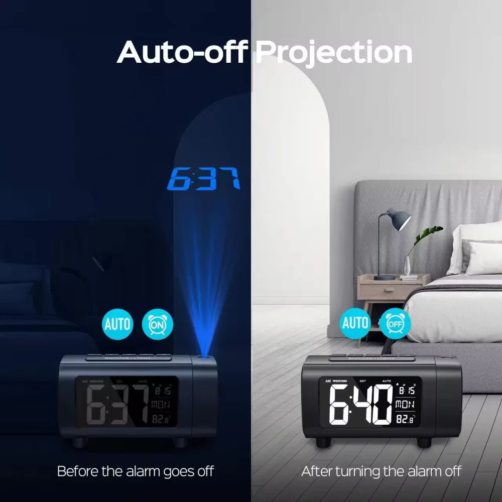 - 180° projektionsdisplay: Projicerer tydeligt klokkeslæt på væg eller loft med 4 lysstyrkeniveauer; justerbar fokus 0,5–5 m. Automatisk slukning efter alarmen stopper.