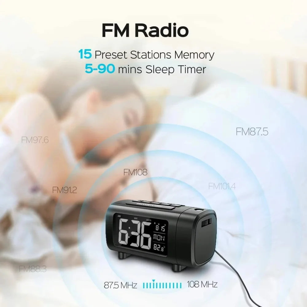 - FM-radio med sleeptimer: 15 FM-stationer (76–108 MHz) med justerbar lydstyrke; falde i søvn med automatisk slukning i op til 90 minutter.