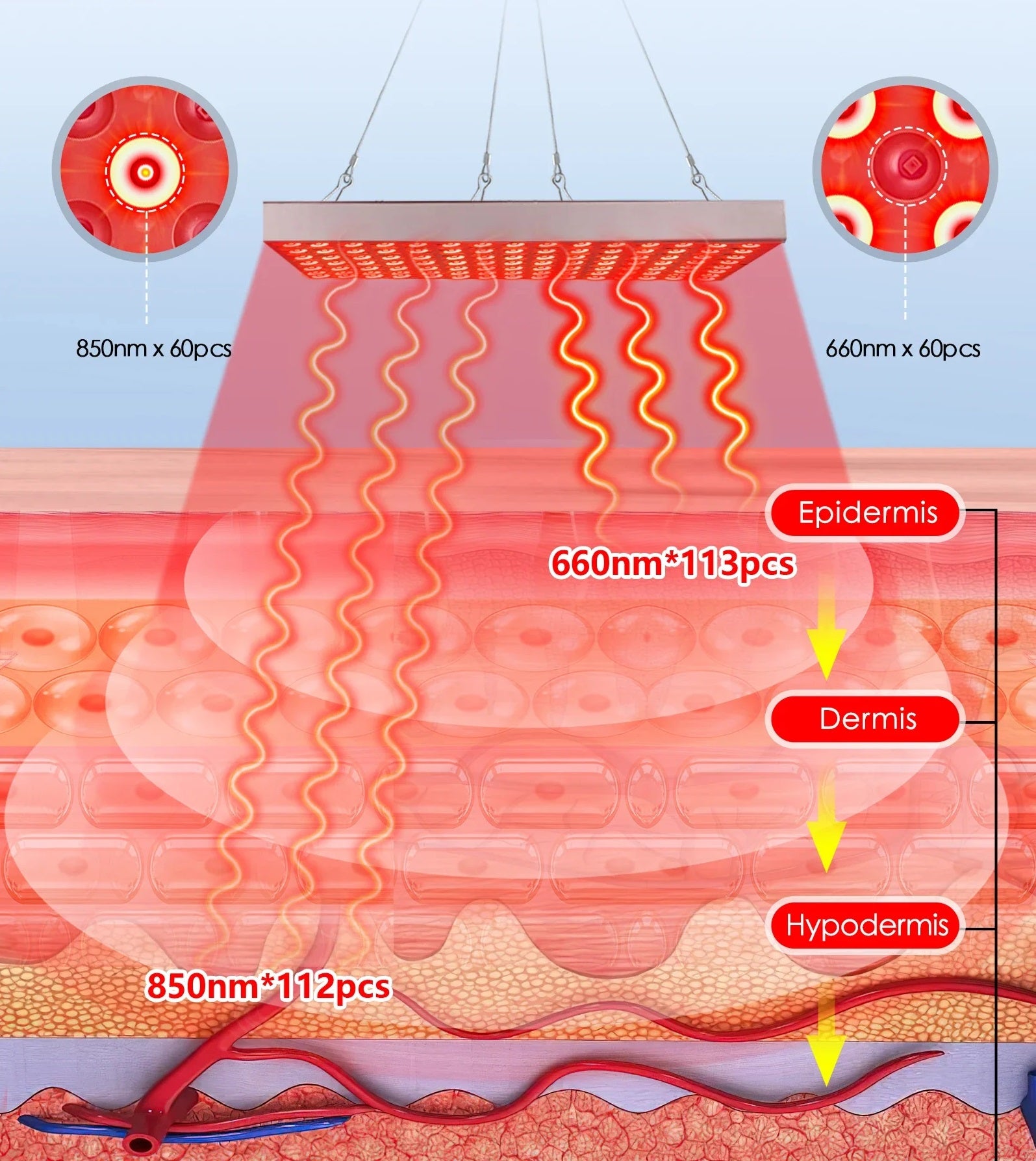 - Dobbelt bølgelængdedesign: Indeholder 113 stk. 660nm rødt lys til hudforyngelse og 112 stk. 850nm infrarødt lys til dybdegående vævsreparation.