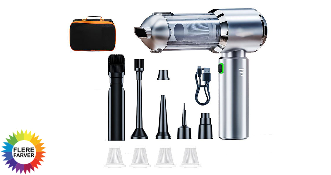 - Kraftig sugeevne: Fjerner hurtigt støv, krummer og dyrehår fra bilen eller hjemmet.