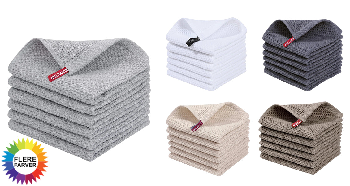 - Vaffelvævet 100 % bomuld: Blød, holdbar og skånsom mod sart køkkengrej, tallerkener og pander.