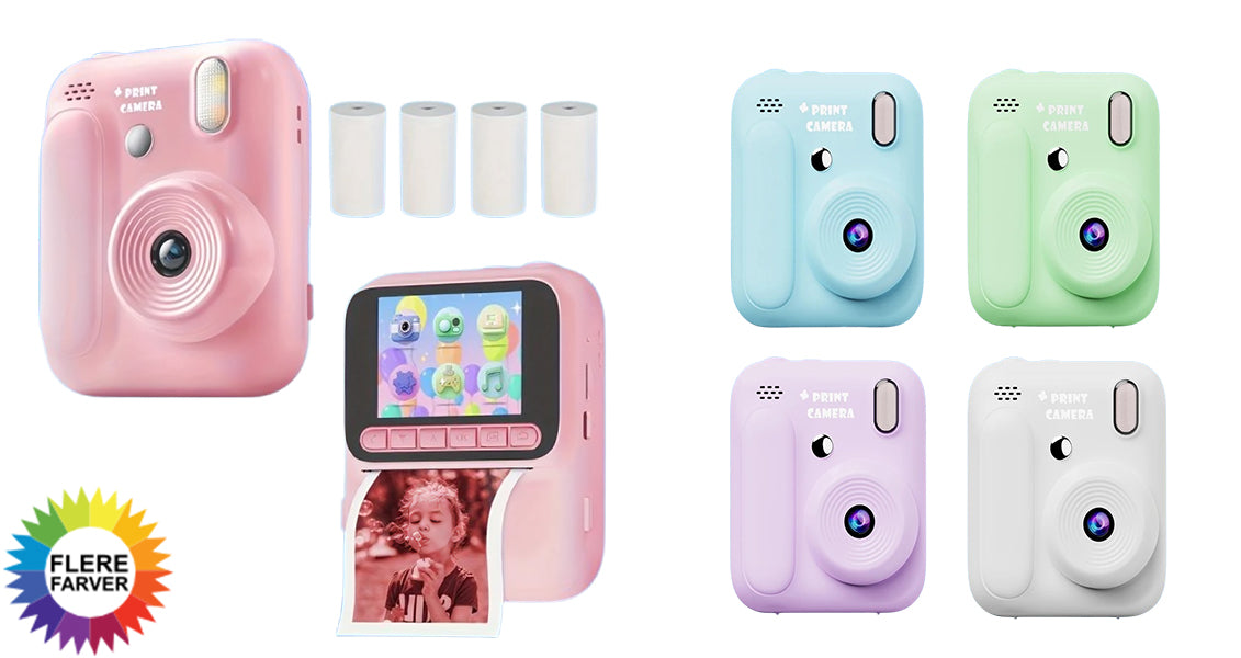 - Farveprintfunktion: Udskriver fotos øjeblikkeligt på termisk papir (57×25 mm, blank farve).
