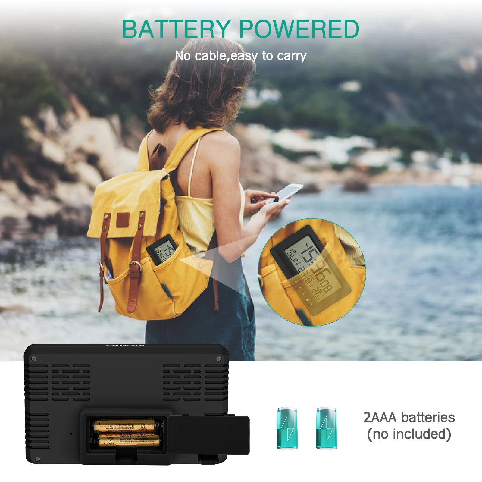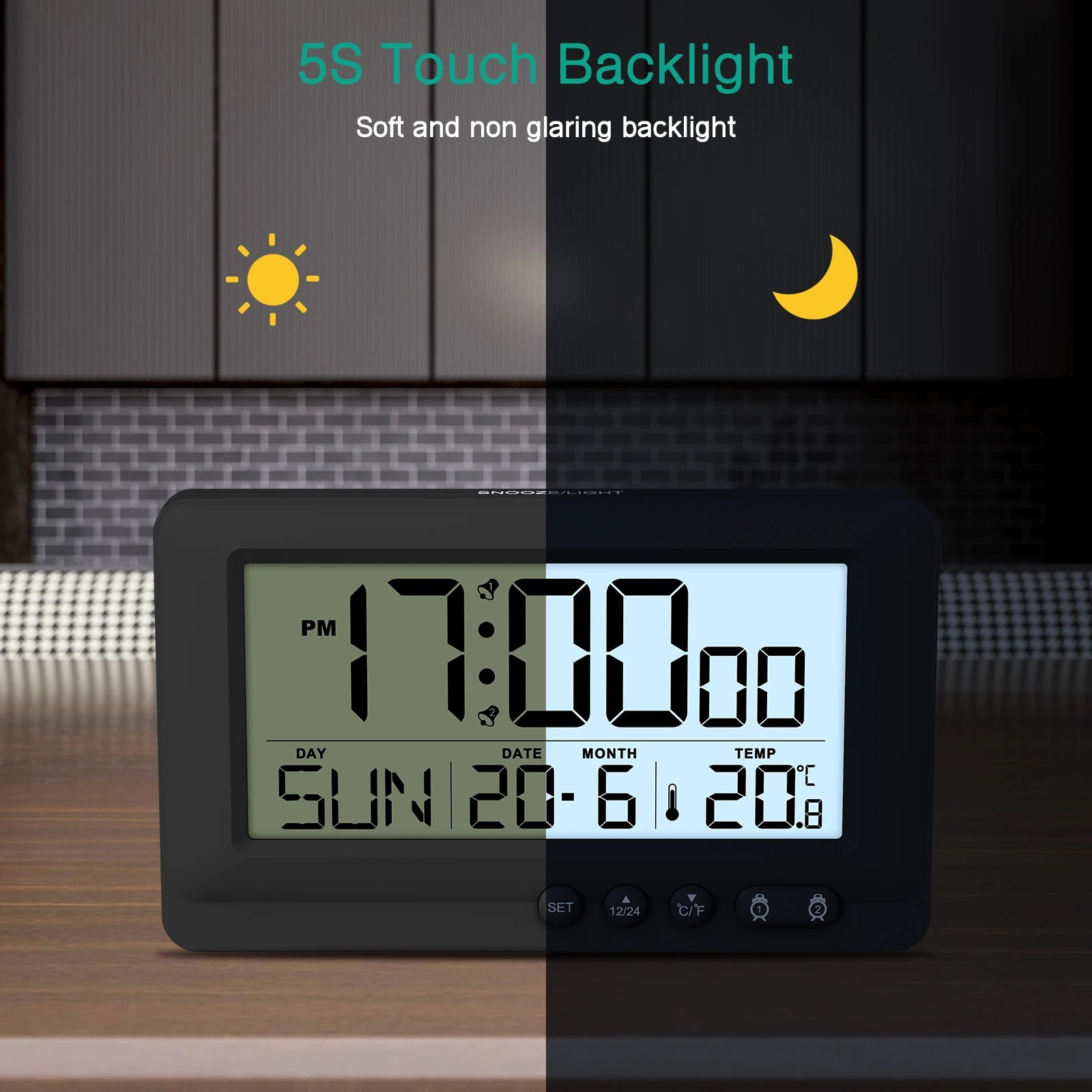 - Snooze & baggrundsbelysning: Snooze-knappen giver 5 ekstra minutters søvn og lyser skærmen op i 5 sekunder for nem visning om natten.