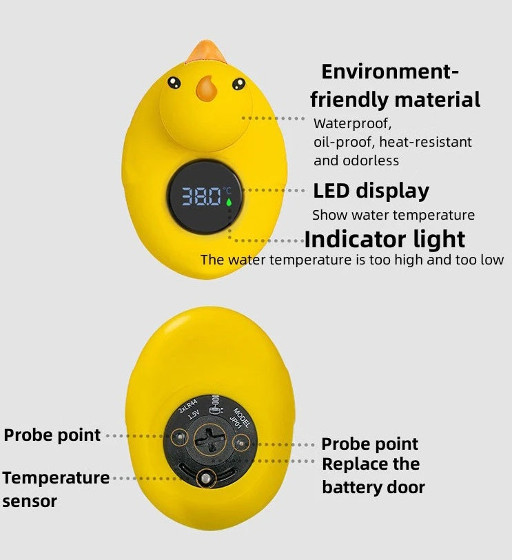 - Let at aflæse: Tydelig digital/analog skærm gør det nemt for forældre at overvåge badevandet med det samme.