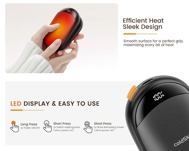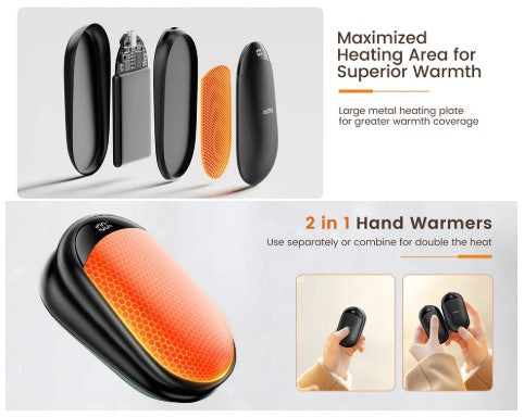 - 2-i-1 magnetiske håndvarmere: Stærke magneter klikker de to håndvarmere sammen og giver 360° varmedækning.