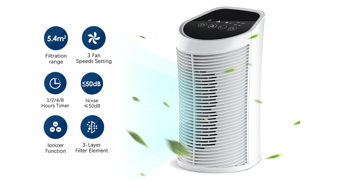 - 3-trins filtrering: Forfilteret fjerner støv, hår og kæledyrshår; HEPA-filteret opfanger 99,97% af pollen, mider og PM2.5; aktivt kul absorberer røg, lugte og VOC’er.