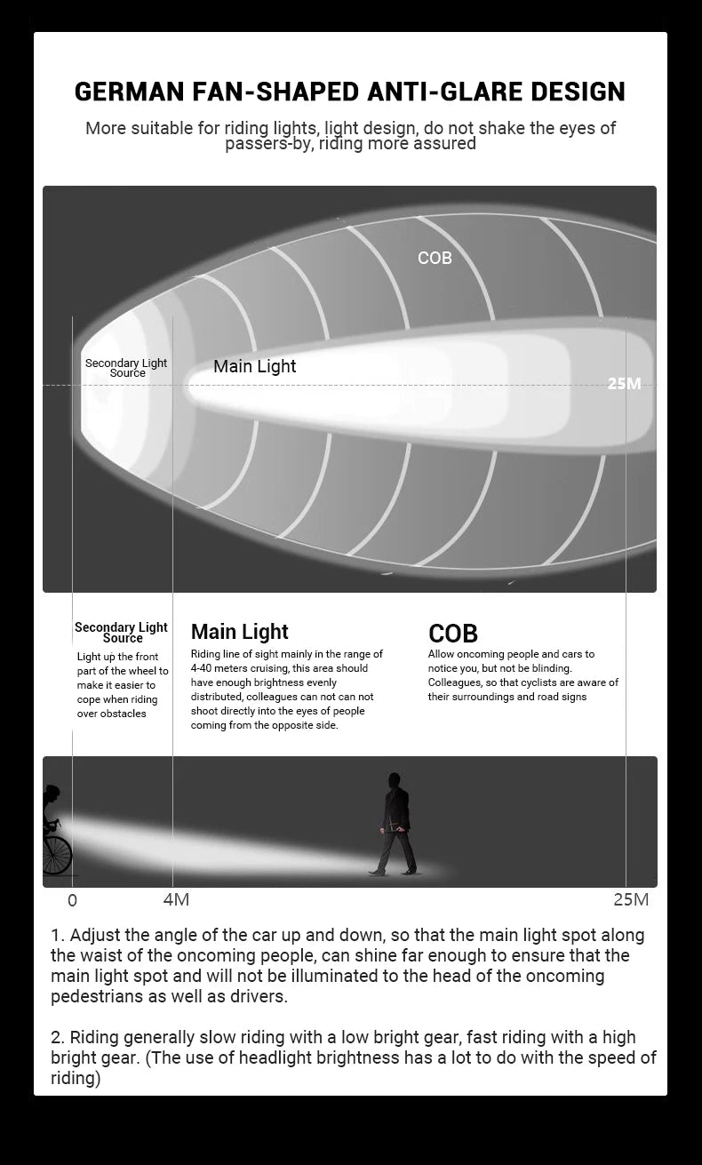 - Blændfri og sikker: Vifteformet lysstråle oplyser vejen uden at blænde andre; LED-dæk- og egerlygter øger synligheden.